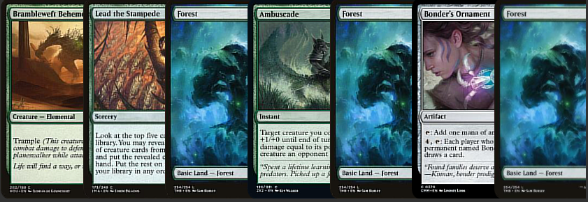 Our land base is actually pretty simple and is almost all forests but we do have some lands that are pretty much card draws like the cycling lands like Slippery Karst and Tranquil Thicket