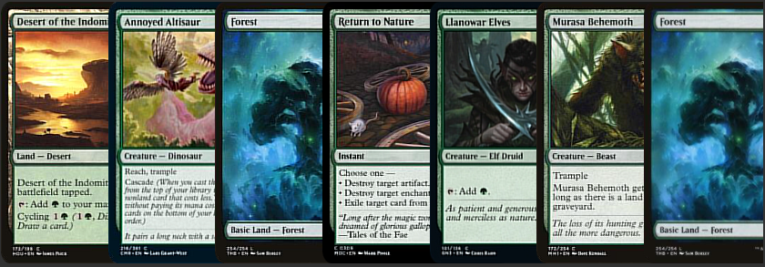 Our main win condition is good old fashioned combat, in addition to our ability to fight an absolute ton of creatures, we are able to control the state of our opponents boards and make combat even easier! Combat is made even easier by the fact that we have ways to give our creatures trample and a lot of our creatures just naturally have trample! There are no infinite combos or loops in the deck!