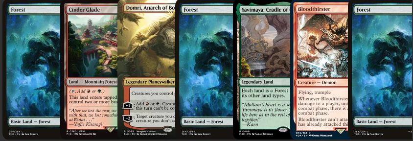 Since we have a pretty high overall cost within the deck, we are running above average at thirty-seven lands, which allows us to commit a lot of lands to the board and ramp hard. We are pretty heavy on basics, but we have quite a few strong non-basics. We have some lands that give us speed, like Stomping Ground