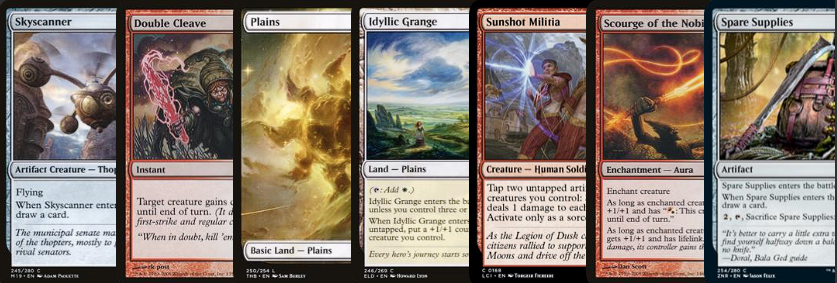 Starnheim Courser and Bladegraft Aspirant are two easy-to-cast creatures that reduce the cost of a large majority of our deck. Goblin Gaveleer and Champion of the Flame are the alternative Voltron creatures that can be great if Caparocti Sunborn is being heavily targeted. Reckless Fireweaver is a great way to translate damage into a card type we are casting frequently. Skyscanner is not only a piece of card draw but it helps with Caparocti Sunborn as well which is pretty strong for only 3 mana. Crimson Fleet Commodore is not only a great aggressive creature but being the monarch gives us more cards, which we will never say no too.