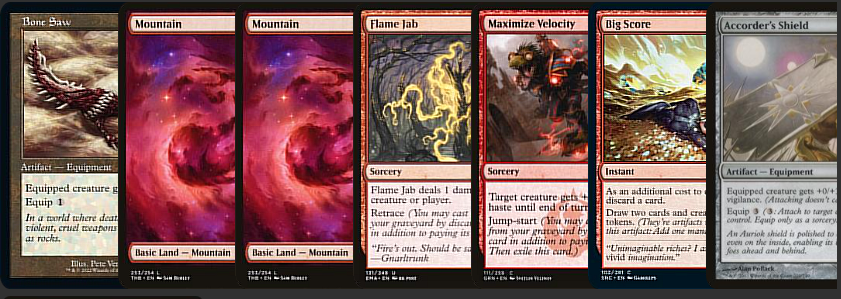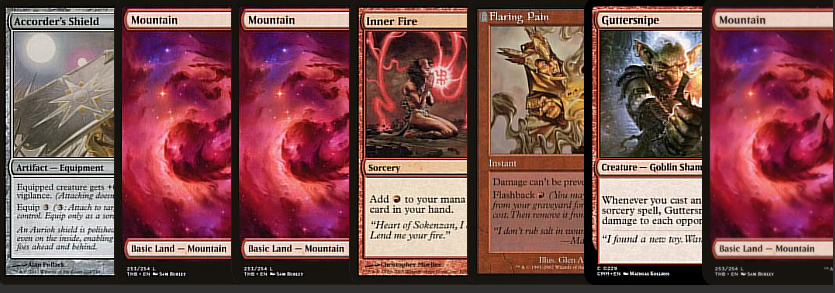 We have an absolute ton of cantrips in our sorcery package like Renegade TacticsFlame Jab and Flame Slash which are all cheap 1 mana cards that allow us to trigger Captain Ripley Vance. Grapeshot is a card we can often use a finisher and kill an opponent! Mana Geyser is a card we can use to produce an absolute ton of mana and begin to go off! Reckless Impulse is a cool card that can help set up our next turn! Rite of Flame is a pretty small “ritual” effect but we will never say no to extra mana!