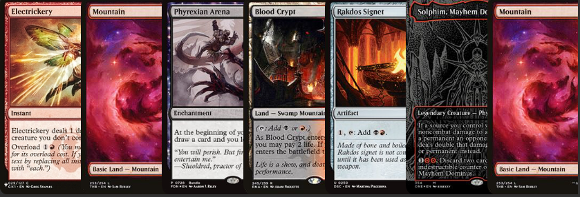 Revel in Riches is one of the main win conditions in our deck, and it is extremely easy to get the ten treasures required to win the game. Arcane Bombardment is a little expensive, but in the end-game, we can get cast a ton and get a ton of damage and life off of this card. It’s a very cool setup card for the deck. Fiery Inscription is pretty strong and essentially a second copy of Guttersnipe. We don’t care at all about the ring tempts, but it can be nice, and extra buffs and abilities are always nice. Sulfuric Vortex is nice passive damage for the deck and a great way to stop all of the lifegain-based strategies running around EDH these days. Since we have a ton of low-cost cards, we tend to run through our hand quite quickly, which is why we are running Phyrexian Arena, which is a cheap and strong card draw for the deck.