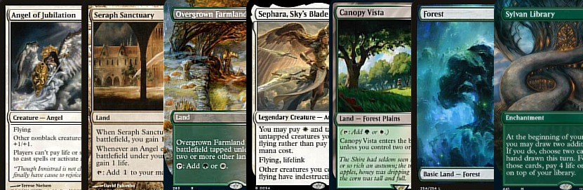 Our artifact package has a ton of cost reducers like Card not found which not only makes creatures but reduces the cost of our angels, this can be super helpful especially in the early game! Card not found is a super great card in any deck that focuses on a single creature type and that is no different in this deck. Incubator has a really big effect when it comes down and may turn your opponents attention to you! Card not found and Card not found are both great cards, Akromas can really change the game when it comes down and makes games end pretty quickly. Vanquishers not only buffs our angels but also is a great source of card draw! The most interesting and arguably best artifact in our deck is Card not found which for only 5 colorless and a 3 colorless tap can put any creature into play from our hand! I used this card often and found that is quite slept in creature focused decks but can have a huge impact being able to cast a 7 or 8 mana angel early can be a real game changer! Arguably the most important artifact in our deck is Card not found since we can use it to manipulate the top of our library and get cards we can cast from sigardas ability. Top is the real deal in this deck and can easily help to give you a creature advanatage