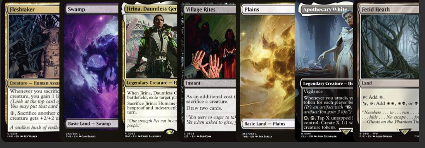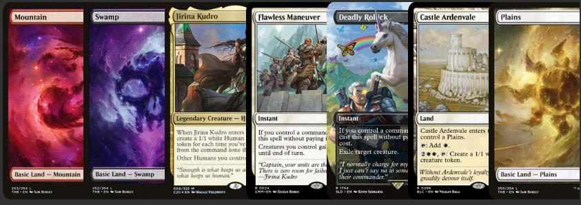 Our landbase is strong and efficeint, since we are in three-color we have quite a high density of dual lands as well as ways to get our colors like Arid Mesa and Marsh Flats which allow us to grab some shocks which can help us get two out of three colors established early which can be quite strong. Castle Ardenvale is another very strong land becasue it can produce a human token which can be used for one of our various payoffs or just sacrificed to Silvar which can be strong as well. Since we are a creature type focused deck we get quite a bit of value out of both Unclaimed Territory and Path of Ancestry. I like this landbase a lot and think it functions very well for the deck.